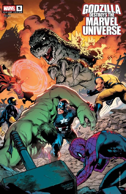WORLD WAR GODZILLA! Make way, True Believers, as Black Panther debuts the mightiest weapon the Marvel Universe has ever seen before in this earth-shattering showdown between Godzilla and Marvel MECHA! As the two titans trade blows, the rest of the heroes race to exploit Godzilla's mysterious relationship to vibranium to help slow down the leviathan — but as the war between the King of the Monsters and the heroes of the Marvel Universe rages on, only one thing is certain: For whoever is left standing in the wreckage, the Marvel Universe will never be the same again!