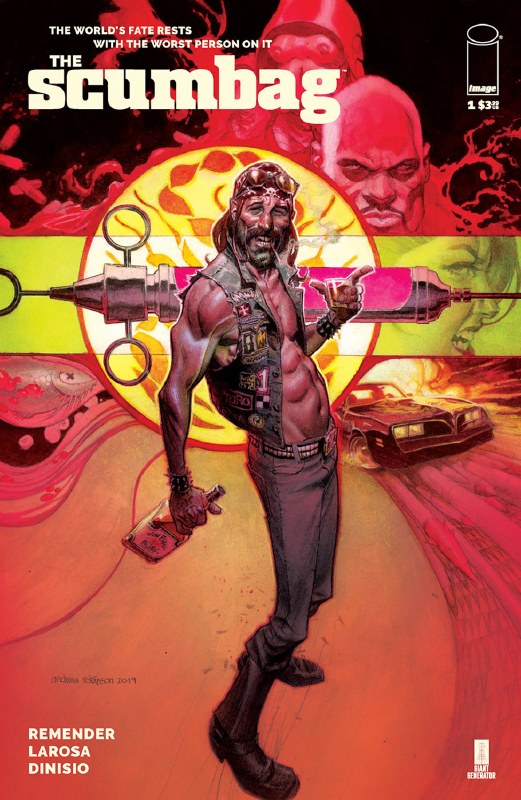 (W) Rick Remender (A) Lewis LaRosa, Moreno DiNisio (CA) Andrew Robinson. "Snowblower Indemnity*" Part One: The fate of the world rests in the hands of the worst person on it! NEW ONGOING SERIES from the writer of DEADLY CLASS! RICK REMENDER launches an all-new comedy espionage series* THE SCUMBAG the story of Ernie Ray Clementine* a profane* illiterate* drug-addicted biker with a fifth-grade education. He's the only thing standing between us and total Armageddon because this dummy accidentally received a power-imbuing serum* making him the world's most powerful super spy. This new ongoing series will feature a murderers' row of all-star artistic talent rotating each issue. The first issue showcases the stunning work of LEWIS LaROSA* with subsequent chapters and covers by brilliant talents such as ANDREW ROBINSON* ERIC POWELL* TULA LOTAY* WES CRAIG* ROLAND BOSCHI* SIMONE DI MEO* MARGUERITE SAUVAGE* DUNCAN FEGREDO* YANICK PAQUETTE* MIKE McKONE* DAVE JOHNSON* MORENO DINISIO* and many more!