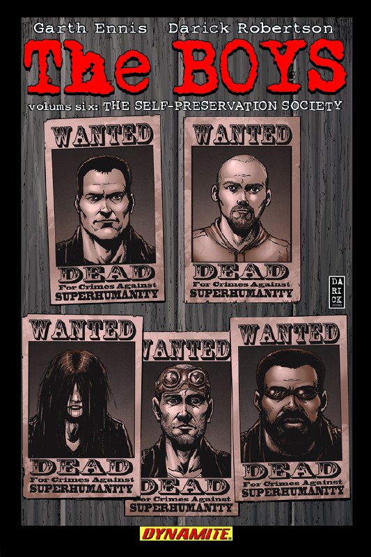 The sixth Dynamite collection of Garth Ennis and Darick Robertson's The Boys is here, with The Boys, Vol. 6: Self-Preservation Society! You can only maim and murder so many superheroes before someone decides to do something about it, and in The Boys' case that means Payback - a superteam of unimaginable power, second only to the mighty Seven. Pulping teenage supes is one thing, but how will our heroes fare against Soldier Boy, Mind-Droid, Swatto, the Crimson Countess, and the Nazi juggernaut known as Stormfront? Blood flies and bones shatter, as Butcher and company meet fire with fire. And in the origin tales of Mother's Milk, the Frenchman and the Female, Hughie learns of the strange paths by which this disparate trio came to join The Boys. From tragedy in Harlem to the slaughter on the Brooklyn Bridge, from the festival of Les Saints De Haw-Haw to the horror lurking under Tokyo, this is a journey of discovery like no other - with only the flickering lamp of insanity to light the way. The Boys, Vol. 6: Self-Preservation Society collects issues 31-38 of the New York Times Best-Selling series by Garth Ennis, Darick Robertson and Judge Dredd co-creator, Carlos Ezquerra, and features all of the covers by Robertson!